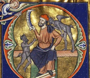Initial D: The Fool with Two Demons (detail) in a psalter, illuminations by the Master of the Ingeborg Psalter, after 1205. Tempera colors, gold leaf, and ink on parchment bound between pasteboard covered with brown calf, each leaf 12 3/16 x 8 5/8 in the J. Paul Getty Museum, Ms. 66, fol. 56.