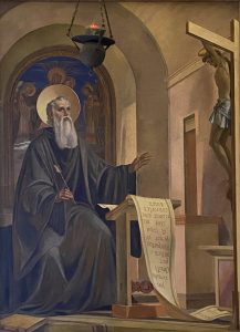 The passage above, from the prologue to the Rule, speaks of reorientation. A lost son decides to go home, to learn to see and hear anew. The reference to deifying light, deificum lumen, is important. To grasp what it means, let us consider a parallel construction. The Latin for ‘bread’ is ‘panis’. From it, a verb is derived, ‘panificere’: which means ‘to make bread’. A ‘panificus’ is a baker. Italians still go twice daily to get fresh loaves from the local panificio, it being unthinkable to eat old bread (from midday) at supper. Even as ‘panificere’ denotes production, the bringing about of the object named before the verbal ‘-ficere’, to do with making, ‘deificere’ means to make someone a god, or, in the language of theology, to ‘divinise’ him. The monk is one who wishes to see restored in him the Godlikeness for which his nature is intended.