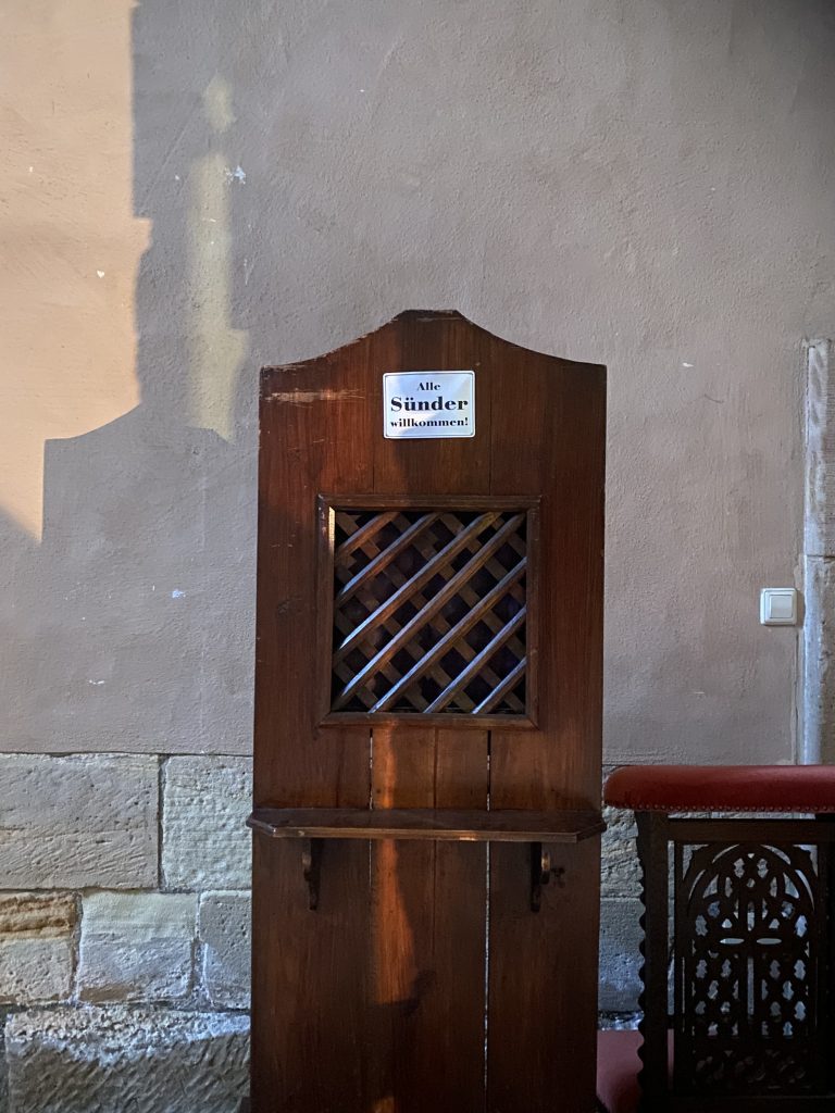 Some weeks ago I visited the abbey church of Otterberg in the Palatinate. It is what remains of a Cistercian monastery founded in the 1160s. Now it serves as joint parish church for a Lutheran and a Catholic parish. The proportions are perfect with gracious aisles, ideal for the processions that were such an important part of the Order’s liturgical life. What chiefly impressed me, though, was this confessional with its metal sign: ‘All Sinners Welcome!’ The exclamation mark is eloquent. It calls out to sinners, ‘You’re one of us – you belong!’ – a sentiment that, if it is sincere, preserves the Christian community from tedious conceit. It struck me as a criterion for synodality. Genuine joint movement is possible from the moment in which I find my place within a body that, conscious of its flagrant imperfection, yet strives to be made perfect, confident that God’s grace does indeed carry and that, to it, nothing is impossible.