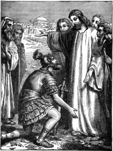 When Jesus went into Capernaum a centurion came up and pleaded with him. ‘Sir,’ he said ‘my servant is lying at home paralysed, and in great pain.’ ‘I will come myself and cure him’ said Jesus. The centurion replied, ‘Sir, I am not worthy to have you under my roof; just give the word and my servant will be cured. For I am under authority myself, and have soldiers under me; and I say to one man: Go, and he goes; to another: Come here, and he comes; to my servant: Do this, and he does it.’ When Jesus heard this he was astonished and said to those following him, ‘I tell you solemnly, nowhere in Israel have I found faith like this. And I tell you that many will come from east and west to take their places with Abraham and Isaac and Jacob at the feast in the kingdom of heaven. Matthew 8.5-11.